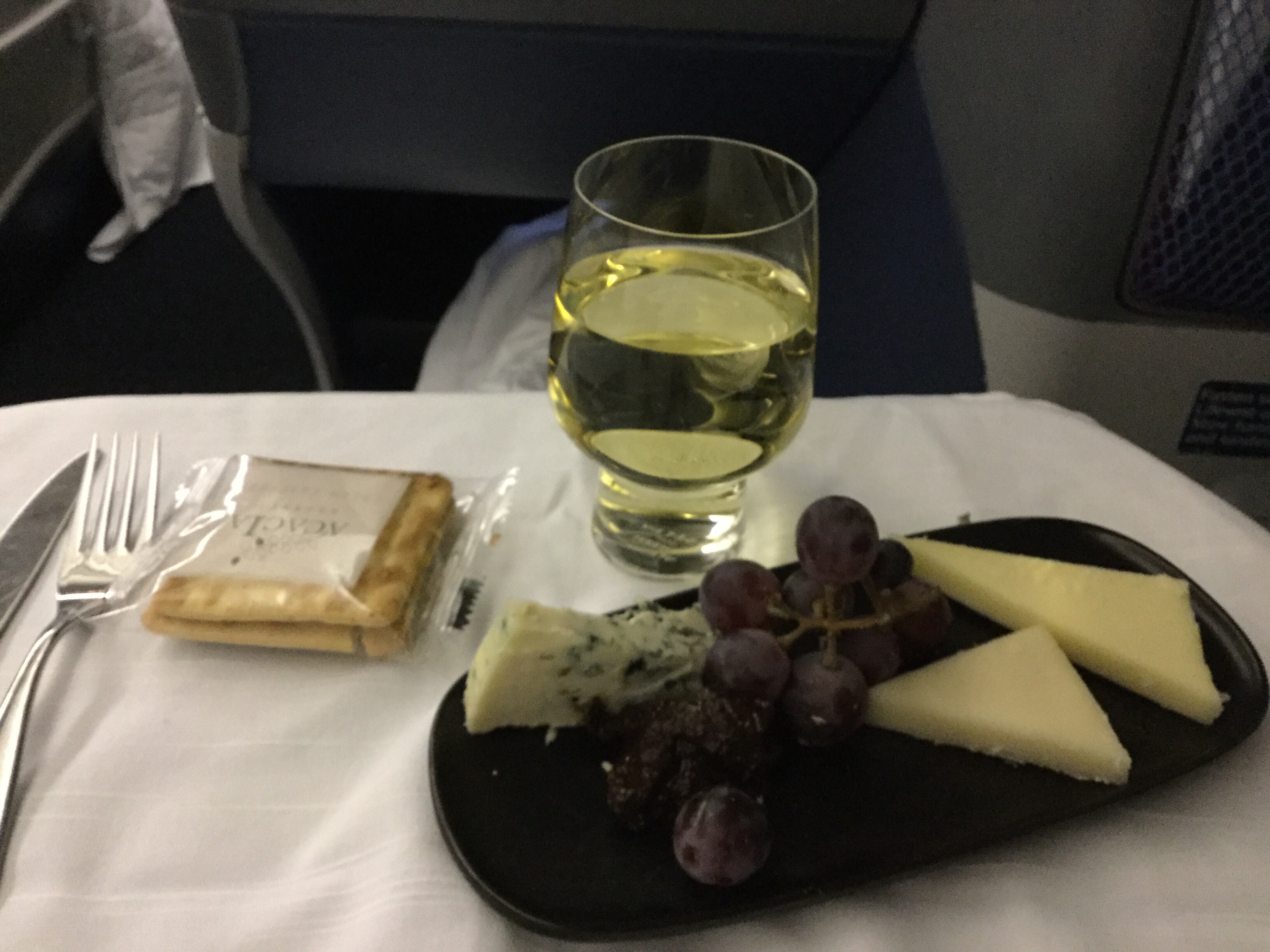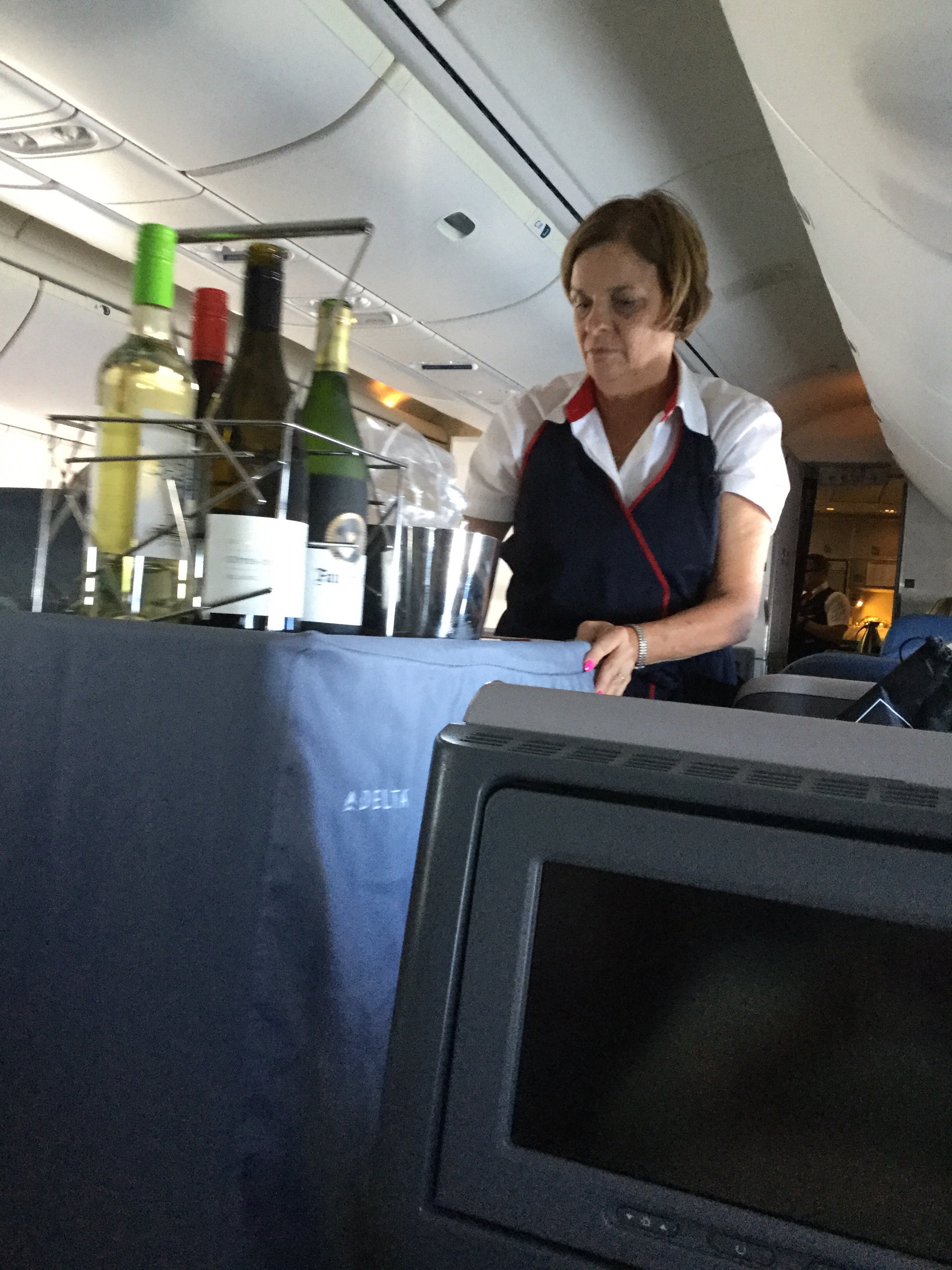 To start the experience you were greeted with a glass of champagne as you boarded the plane then you were directed to your assigned seat. But it’s not just a seat – it’s a pod or something! The seat turns into a bed (totally flat- not just reclining). You have a keyboard of buttons to move in every direction. Plus a back massage that you can continually push if you want.