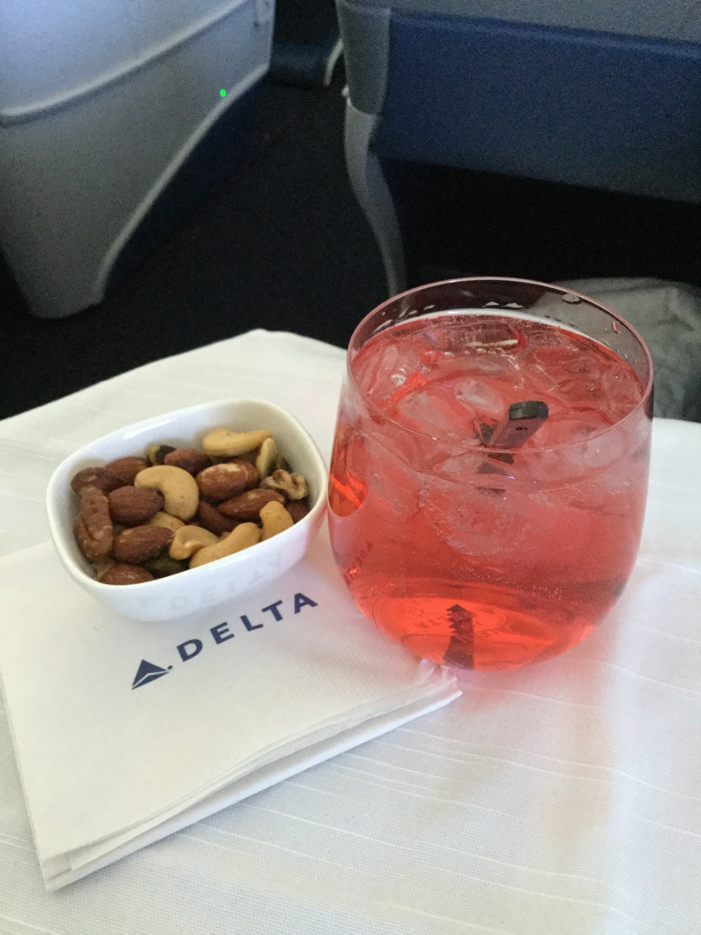After takeoff, cocktails were served with heated mixed nuts!