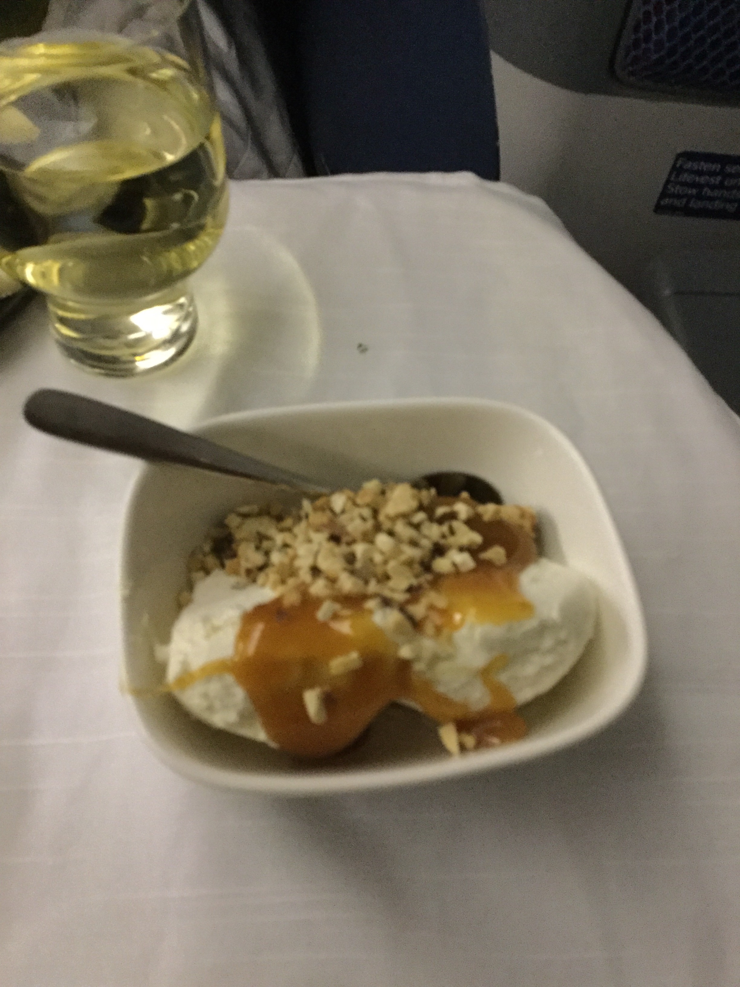 Your complete comfort is catered to in every step. This maybe the best international flight ever!😊 Menus were handed out and then personal orders were made. The choices were awesome-Pistachio Crusted Australian Lamb Rack, Chicken Milanese, Bourbon Grilled Cedar Plank Salmon, Cacio e Pepe Ravioli. No pictures of the entrees since I feel asleep and missed supper. 😳. But I didn’t miss dessert!